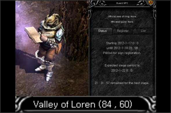 When the guild of a registrant is selected, the invading team and their allies will have a sword icon and defending and their allies will have a shield icon. PK penalty do not apply between the guilds of the invading and defending team. The above condition is applicable to the Loren Valley only PK penalty will not be applied to both invading team and defending teams but will be applicable to other characters who are not participants. The Guild Masters will have a crown mark on the top instead of sword or shield mark. Neutral characters will not be marked as attackers or defenders. Guild registration/withdrawal during the battle is not allowed.